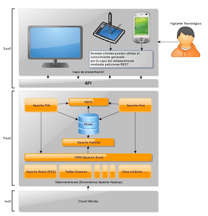 La adquisición de información se realiza mediante capas modulares de extracción, transformación y carga (ETL), encargadas de capturar información heterogénea de diferentes recursos (redes sociales, páginas web, documentos corporativos, documentos científicos, patentes...). La arquitectura está preparada para la captura de información, tanto estructurada como no estructurada, donde herramientas del ecosistema Hadoop [8] como Apache Pig [9], Apache Hive [10] o Apache Mahout [11], juegan un papel fundamental tanto en fases de análisis y procesamiento del lenguaje natural (PLN) como en fases de predicción, clasificación o clústering o análisis del sentimiento.