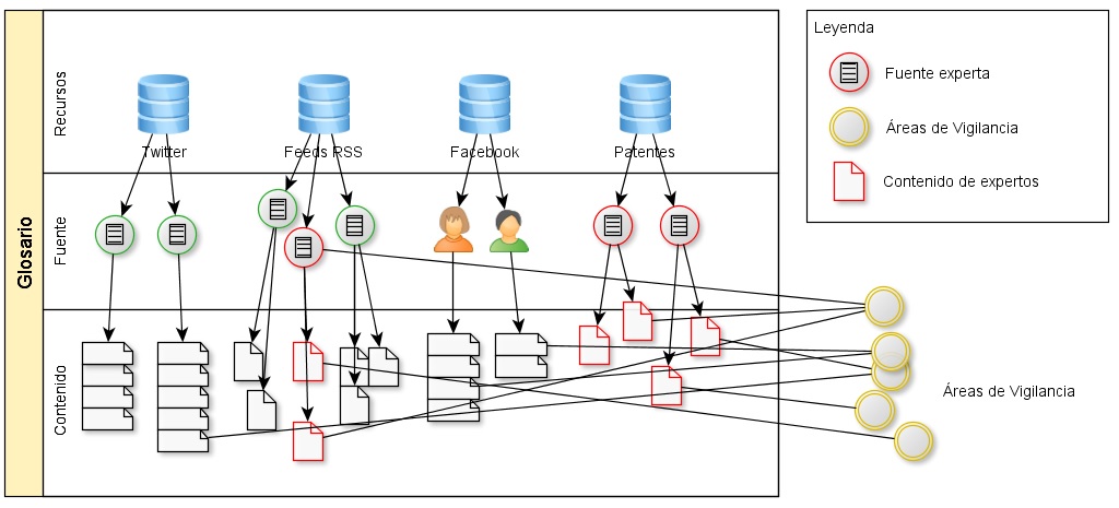 Se define como recurso el lugar donde las fuentes generan un contenido. Ejemplos de recursos pueden ser Twitter, feeds de RSS, bases de datos de patentes, etc. Las fuentes son los usuarios, los identificadores o los nicks que generan contenido en cada recurso, mientras que el contenido representa la información generada por una fuente (una noticia de RSS, un tweet, una patente...). Las áreas de vigilancia tecnológica son las líneas de investigación establecidas por la organización; el sistema y los usuarios se encargarán de clasificar los contenidos por áreas para adecuar los contenidos a las áreas (clasificados de forma manual por el usuario y de forma automática por el sistema). Una fuente puede pertenecer a varias áreas de vigilancia, ya que los contenidos pueden tratar diversos temas, y los contenidos de una fuente pueden ser clasificados independientemente en diversas áreas de vigilancia.